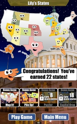 You earn a random state for every successfully completed level. All of your states appear on your own personalized map of the United States. Try to collect all 50! As you earn more states, you begin to unlock the four free bonus games: Map It, Pile Up, Puzzler and Capital Drop. Four games in one!